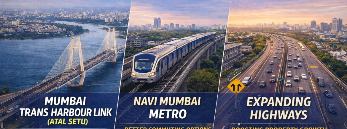 Navi Mumbai is rapidly transforming due to major infrastructure projects that are improving connectivity, boosting real estate demand, and creating new economic opportunities. One of the most significant developments is the Mumbai Trans Harbour Link (Atal Setu), which connects Mumbai to Navi Mumbai and drastically reduces travel time between the two regions.
